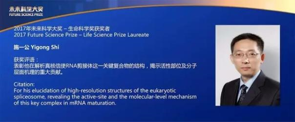 2017年9月9日,施一公教授榮獲“未來(lái)科學(xué)大獎(jiǎng)-生命科學(xué)獎(jiǎng)”,獲獎(jiǎng)評(píng)語(yǔ)中寫(xiě)道,該獎(jiǎng)項(xiàng)旨在“表彰他在解析真核信使RNA剪接體這一關(guān)鍵復(fù)合物的結(jié)構(gòu),揭示活性部位及分子層面機(jī)理的重大貢獻(xiàn)”,可謂實(shí)至名歸!