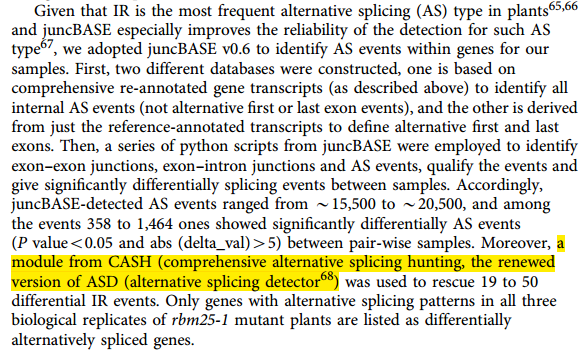 CASH算法發(fā)表之后也引起了研究界的廣泛關(guān)注。中科院上海植物逆境中心主任朱健康院士于7月份發(fā)表在Nature Communications上的研究以模式植物擬南芥為研究材料,發(fā)現(xiàn)了一個(gè)在植物對(duì)外源脫落酸(ABA)脅迫的應(yīng)答中起關(guān)鍵作用的RNA剪接因子ROA1/RBM25, CASH算法在其中發(fā)揮了重要的作用[18]。朱健康院士的研究再次證明了對(duì)植物進(jìn)行可變剪接研究的重要性,也為CASH算法在植物可變剪接中的應(yīng)用提供了強(qiáng)有力的支持。