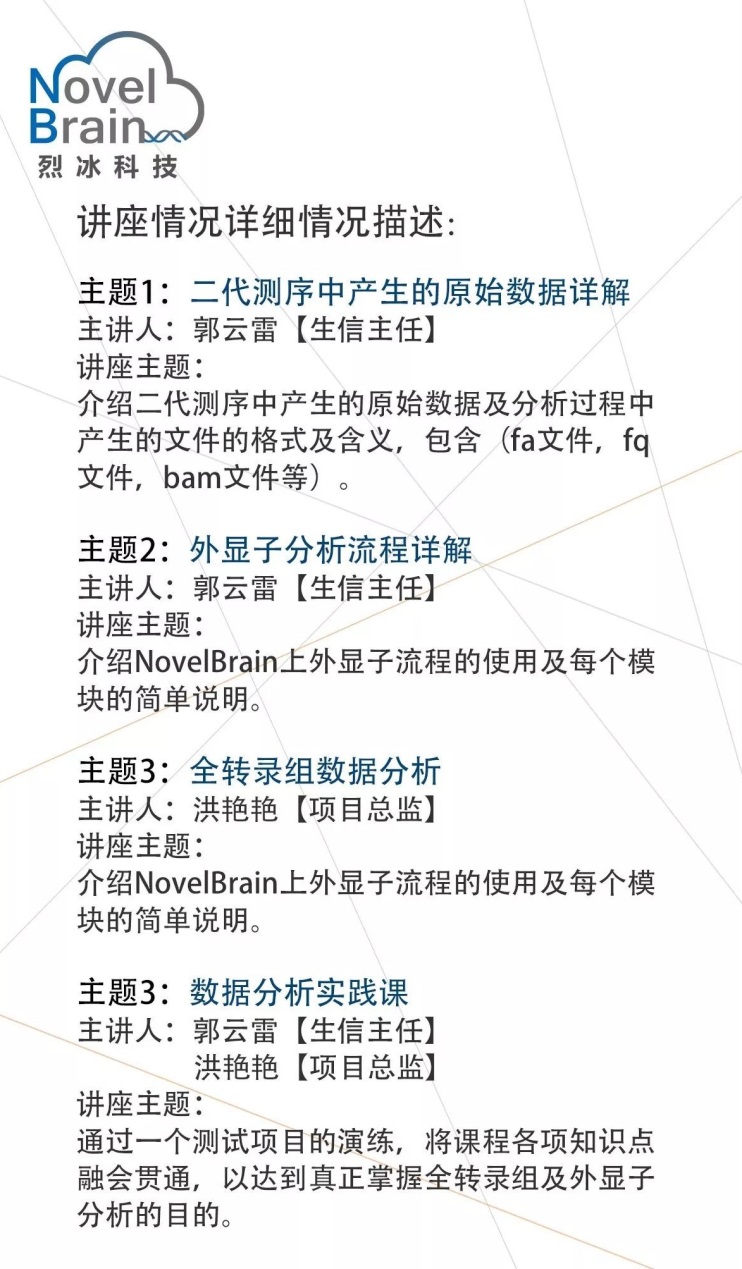 烈小冰使出渾身解數(shù),聚集了烈冰的各部門大牛,包括技術(shù)部、生信部、項(xiàng)目部和研發(fā)部等,組成史上最豪華講師天團(tuán),為您呈現(xiàn)為期5天的NovelBrain®云計(jì)算生物信息與實(shí)戰(zhàn)培訓(xùn)課程。目前該培訓(xùn)班第一期(11月20號(hào)-24號(hào))已經(jīng)滿額,感興趣的老師可繼續(xù)報(bào)名12月18號(hào)-22號(hào)的《NovelBrain®云計(jì)算生物信息與實(shí)戰(zhàn)培訓(xùn)班》第二期哦~
