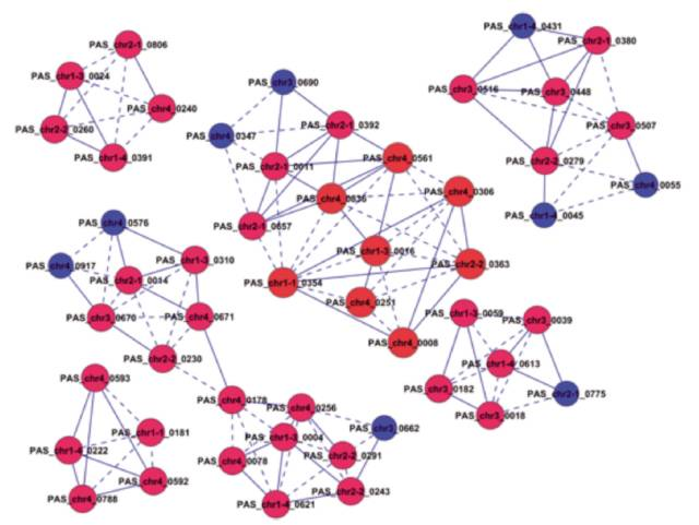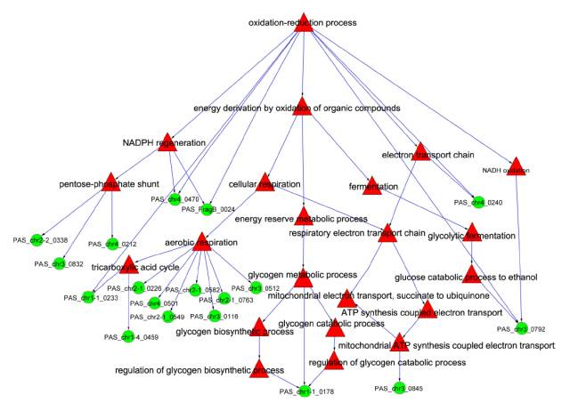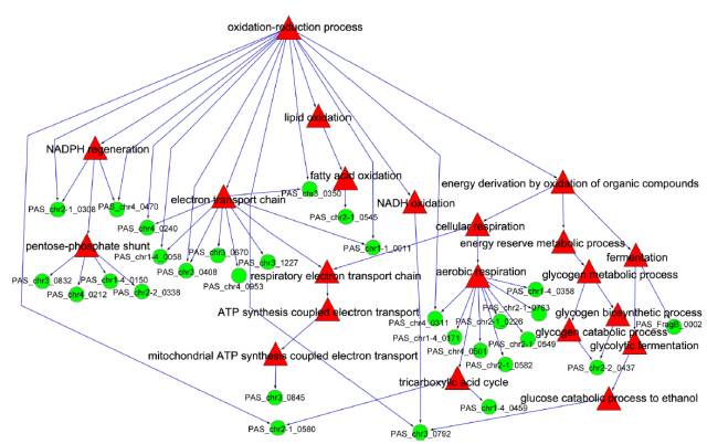 酵母發(fā)酵過程主要有5個時間節(jié)點,1-(12h)-對數(shù)生長期,2-(30h)-甲醇取代甘油作為能源起始點,3-(48h)-酵母適應(yīng)甲醇生長階段,4-(90h)-產(chǎn)物積累頂峰,5-(108h)-發(fā)酵結(jié)束和產(chǎn)物降解。酵母發(fā)酵過程有兩個關(guān)鍵階段,限制碳源替代和甲醇誘導(dǎo)蛋白表達。限制碳源替代就是把酵母發(fā)酵的能源從甘油轉(zhuǎn)變?yōu)榧状迹湍感枰?jīng)過一段時間的適應(yīng)過程才能繼續(xù)生長;甲醇誘導(dǎo)蛋白表達是酵母適應(yīng)了甲醇以后大批量生產(chǎn)蛋白及末期細胞凋亡和產(chǎn)物降解的過程。為了探究這兩個階段中基因發(fā)生的變化,分別取這兩個階段中三個重要的節(jié)點做了趨勢分析(1-2-3即限制碳源替代和3-4-5即甲醇誘導(dǎo)蛋白表達)。用GO-Term進行聚類,最后通過co-exp-net鎖定一個與氧化還原代謝相關(guān)的基因PAS_chr2-1_0582,并通過同源重組的方法敲除目的基因,發(fā)現(xiàn)醇類消耗是對照組的1/5,過氧化物酶體生成也是減少的。