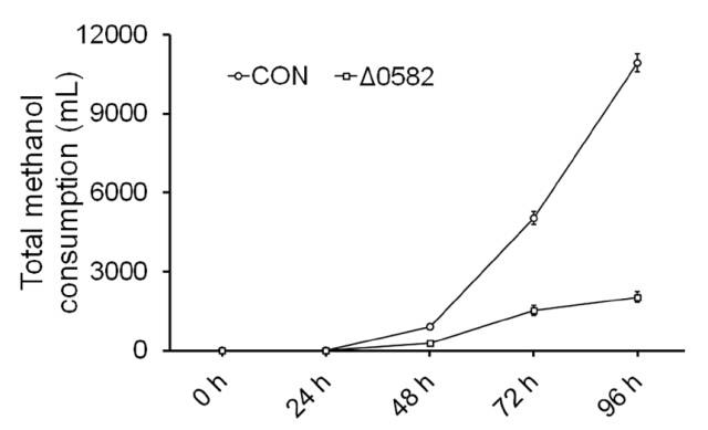 5. 選取了與氧化還原過程相關(guān)的核心基因PAS_chr2-1_0582運用同源重組進行敲除驗證發(fā)現(xiàn)此基因敲除可抑制醇類的消耗,證明了此基因確實與氧化還原過程相關(guān)。