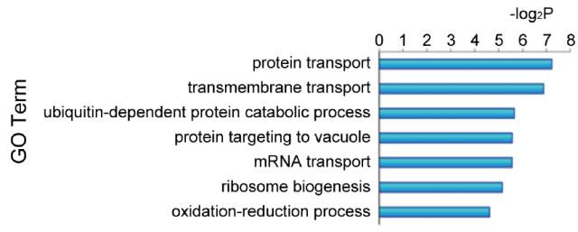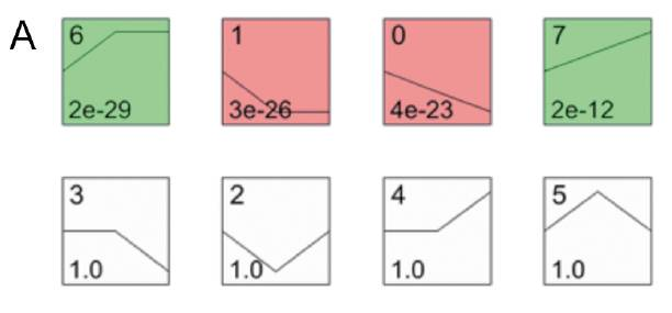 2. 分別對1-2-3和3-4-5兩種結(jié)果進行了趨勢分析,并對差異基因進行GO功能富集。發(fā)現(xiàn)1-2-3階段趨勢6和趨勢7(上升的趨勢)主要與囊孢子形成和跨膜轉(zhuǎn)運等相關(guān),而趨勢0和趨勢1(下降的趨勢)主要與轉(zhuǎn)錄調(diào)節(jié)有關(guān)。這與酵母發(fā)酵生長曲線使一致的。而3-4-5階段趨勢5(先升后降)和趨勢3(先平后降)主要與蛋白轉(zhuǎn)運相關(guān)。