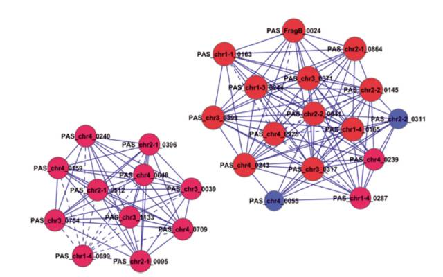 3. 分別對1-2-3和3-4-5兩個階段的相關(guān)基因做了共表達網(wǎng)絡(luò)分析,找出核心基因。