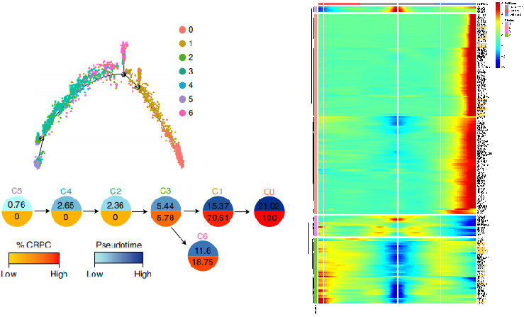 注:細(xì)胞間狀態(tài)轉(zhuǎn)換的pesudotime軌跡圖(左)、軌跡中細(xì)胞占比餅圖(左下) 和?Heatmap圖(右)