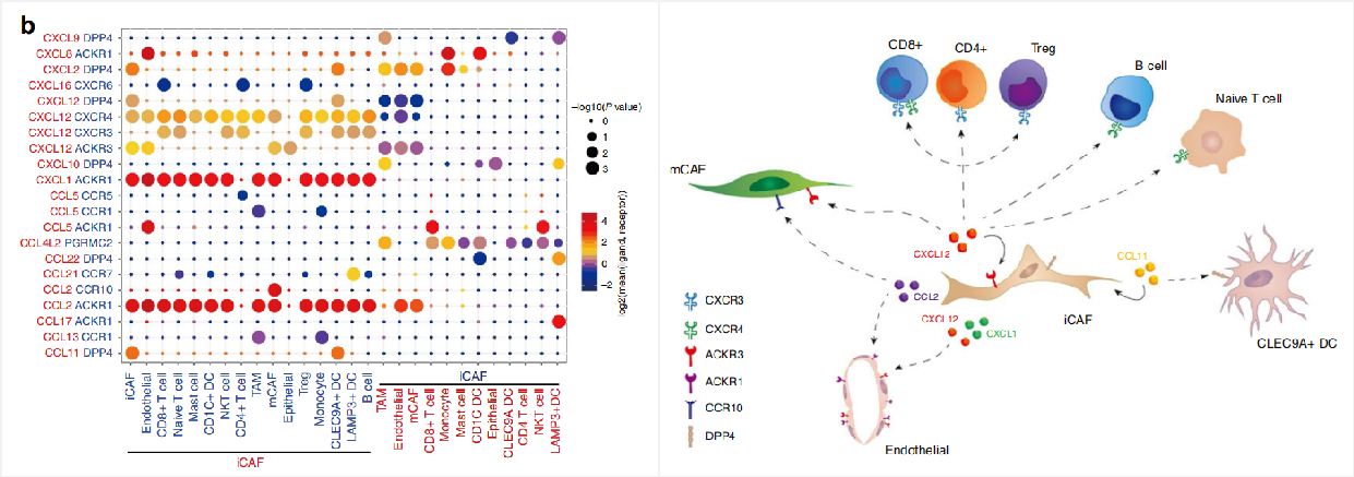 注:左圖:橫坐標(biāo)表示細(xì)胞類型,縱坐標(biāo)表示細(xì)胞間通訊配受體關(guān)系,圓圈大小表示顯著性差異水平,圓圈顏色越紅表示細(xì)胞間通訊關(guān)系越強(qiáng)