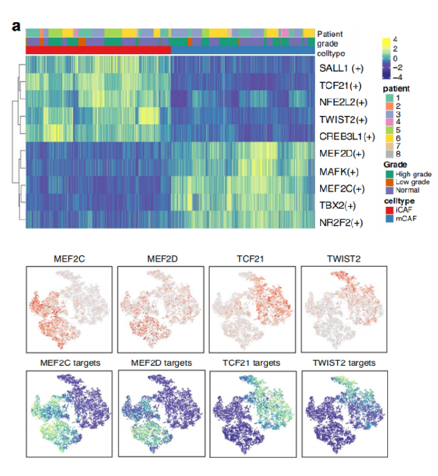 基于已知的轉(zhuǎn)錄因子靶點(diǎn)數(shù)據(jù)庫(kù),以及轉(zhuǎn)錄因子和靶基因的表達(dá)矩陣,采用SCENIC算法,對(duì)于轉(zhuǎn)錄因子的調(diào)控網(wǎng)絡(luò)進(jìn)行計(jì)算,得到在每一個(gè)細(xì)胞中表達(dá)的轉(zhuǎn)錄因子的調(diào)控基因以及調(diào)控強(qiáng)度。