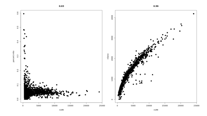 注:橫坐標(biāo)表示每個(gè)細(xì)胞中UMI的數(shù)量,縱坐標(biāo)表示線粒體基因的占比情況