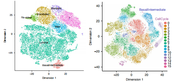 注:左圖為前列腺腫瘤組織細(xì)胞亞群鑒定t-SNE圖展示;右圖細(xì)胞亞群分群情況