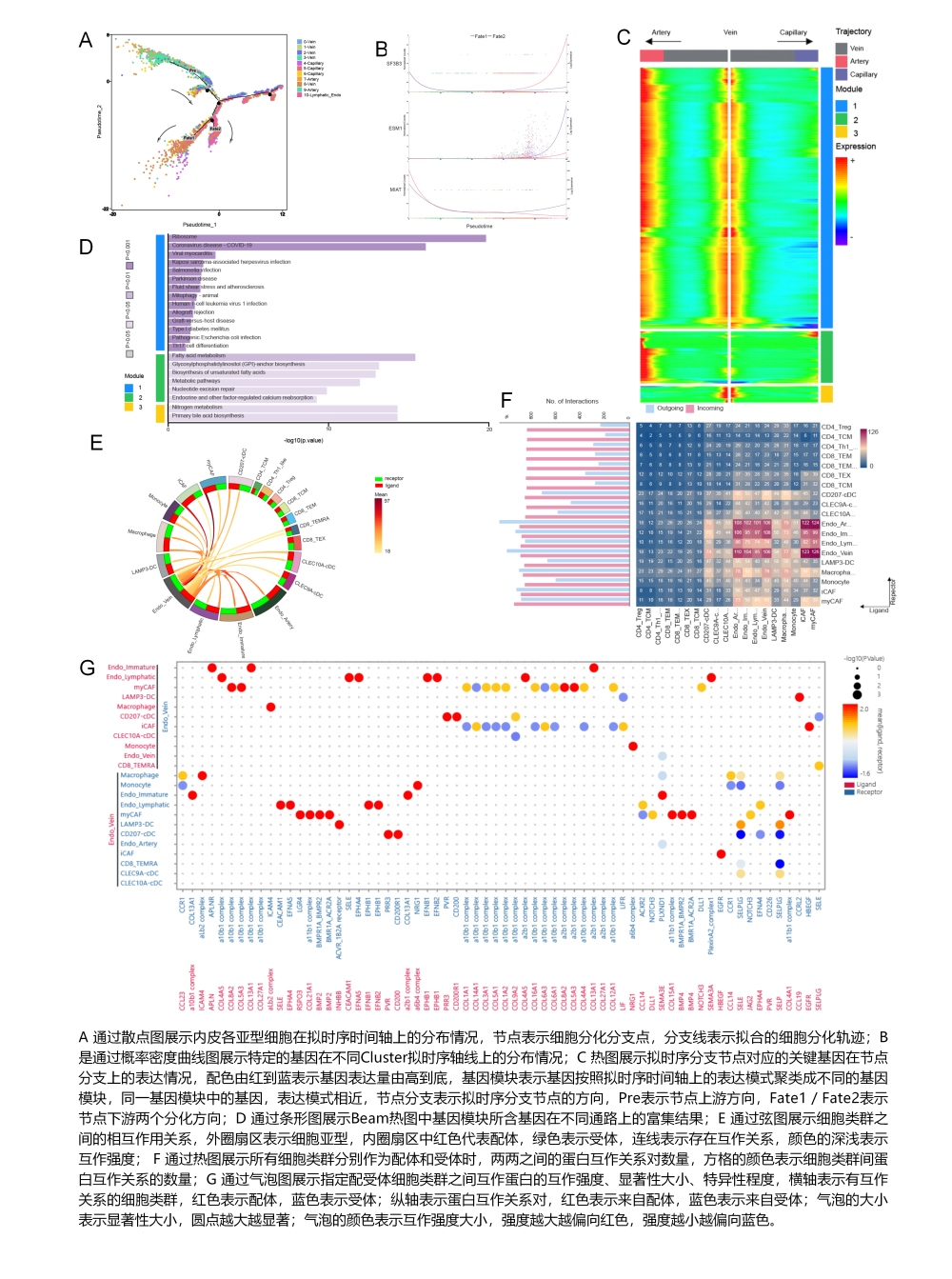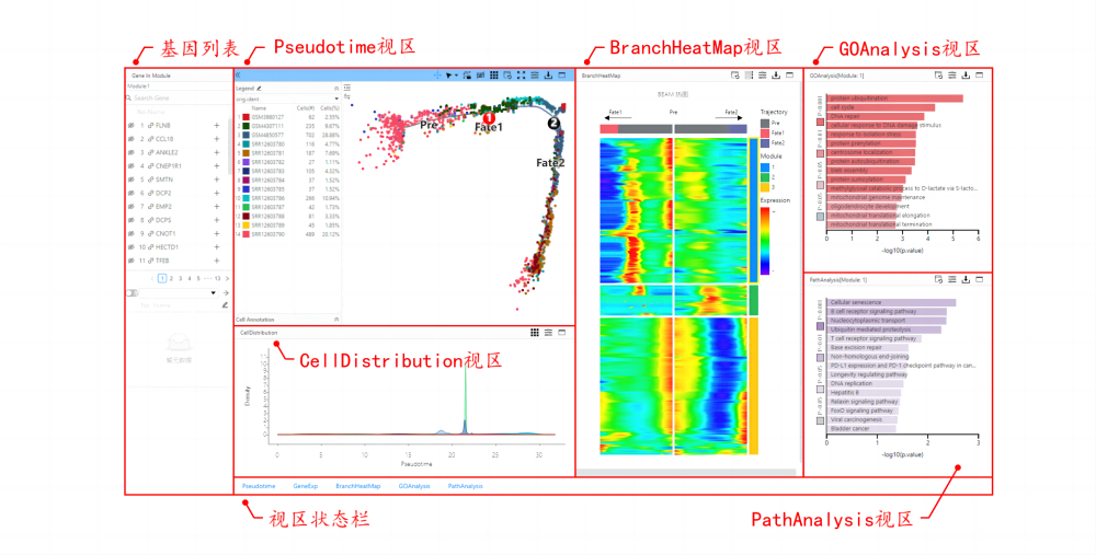 在線實時查看擬時序圖中隨著擬時序軌跡各細胞類群之間可能的演化關系,以及細胞類群或樣本的概率密度分布曲線。通過點擊擬時序圖中分支節(jié)點,切換擬時序分支熱圖查看對應的基因模塊,以及這些基因模塊對應的功能通路分析結果。也可查看用戶關注的基因在擬時序圖中表達情況。