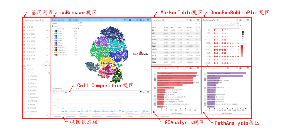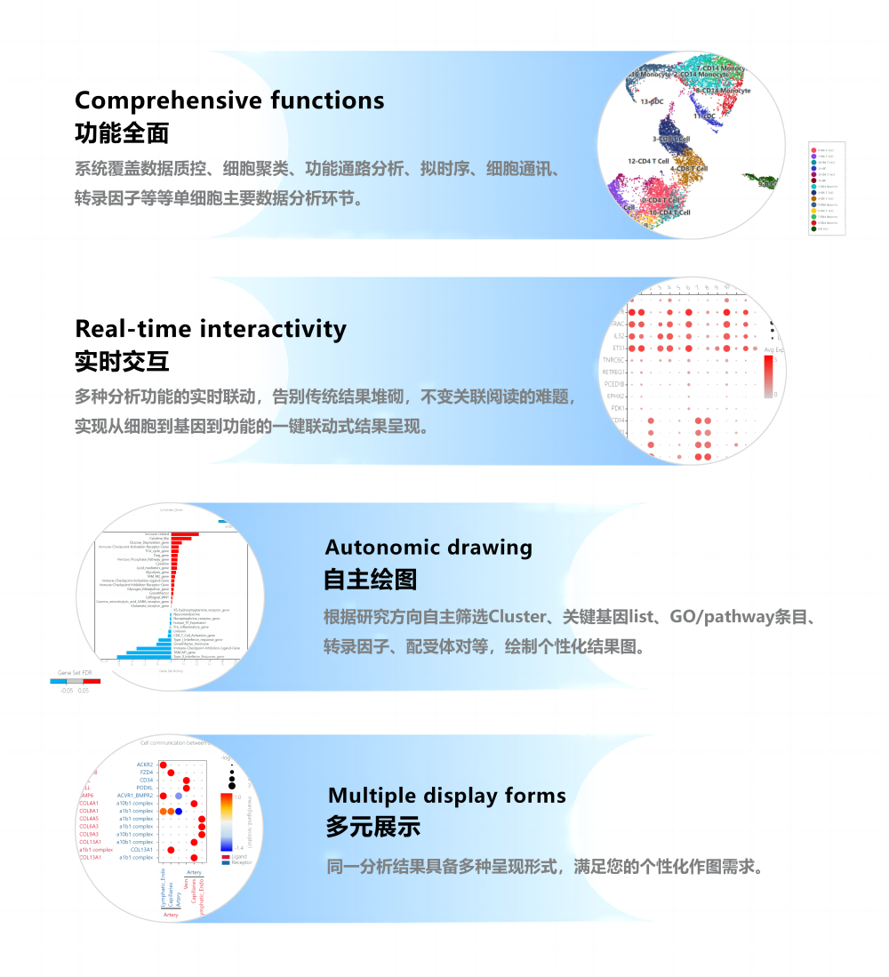 集成單細胞分析結果可視化展示與交互式解讀為一體的軟件產品,無需依托任何服務機構,快速篩選單細胞分析結果的關鍵信息,自主繪制形式多樣的結果圖片,一站式串聯(lián)研究論著文章故事線。