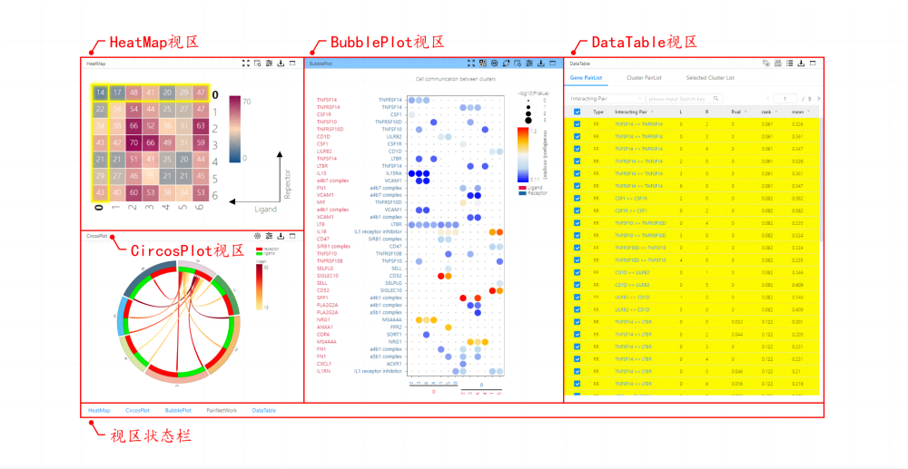 (CircosPlot)查看各細胞類群作為配體受體之間潛在的交互作用。通過點擊指定條目,可在氣泡圖 (BubblePlot)/網絡圖